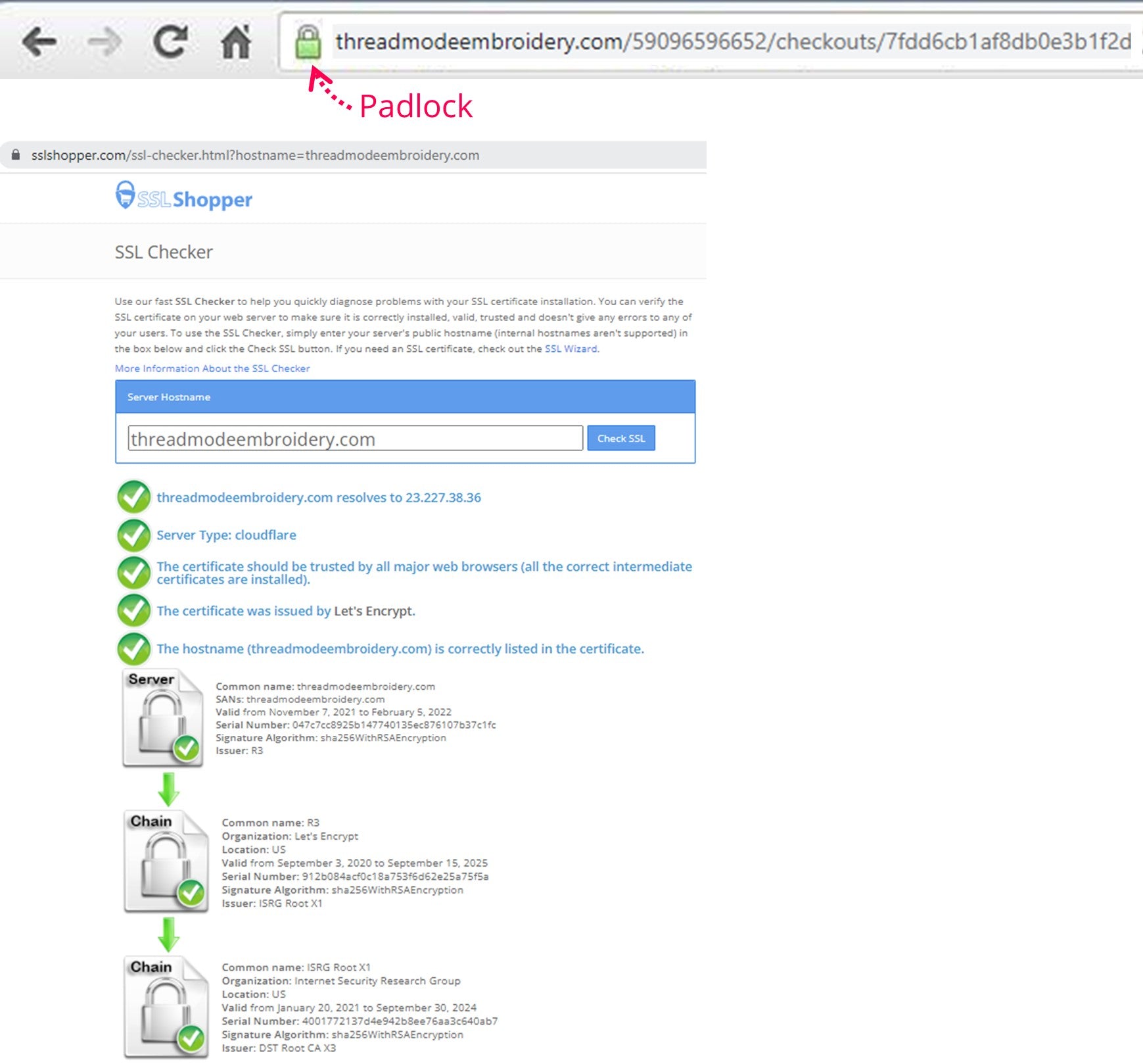 When you make a purchase at ThreadMode Embroidery it is being done though the Shopify network. You will notice the padlock in the bar before the https. This signifies that you have now entered a secure server so you can be very confident the information you enter is protected.